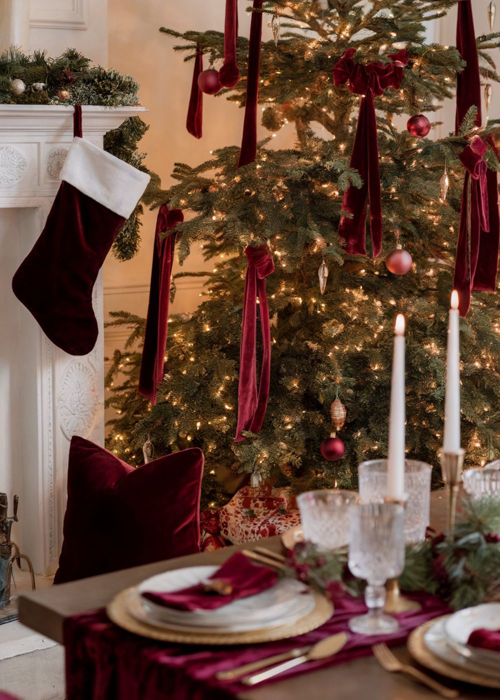 This theme highlights rich burgundy tones paired with gold, cream, and warm neutrals for a luxurious holiday look. Velvet ribbons, satin ornaments, and metallic accents create a layered, elegant texture. Soft, warm lighting enhances the richness of the palette and gives the space a cosy glow.