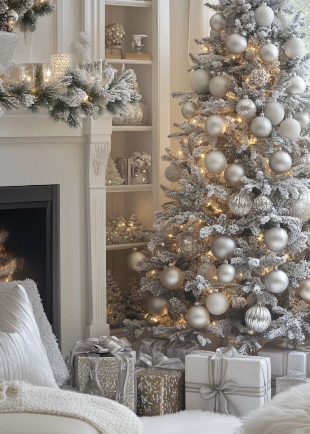 Crystal Glam combines a mix of silver and crisp white for a sparkly, modern winter aesthetic. Glass ornaments, mirrored finishes, and glittered branches create a modern, high-glam texture throughout your home. Opt for warm white lighting to keep your home cosy rather than clinical.