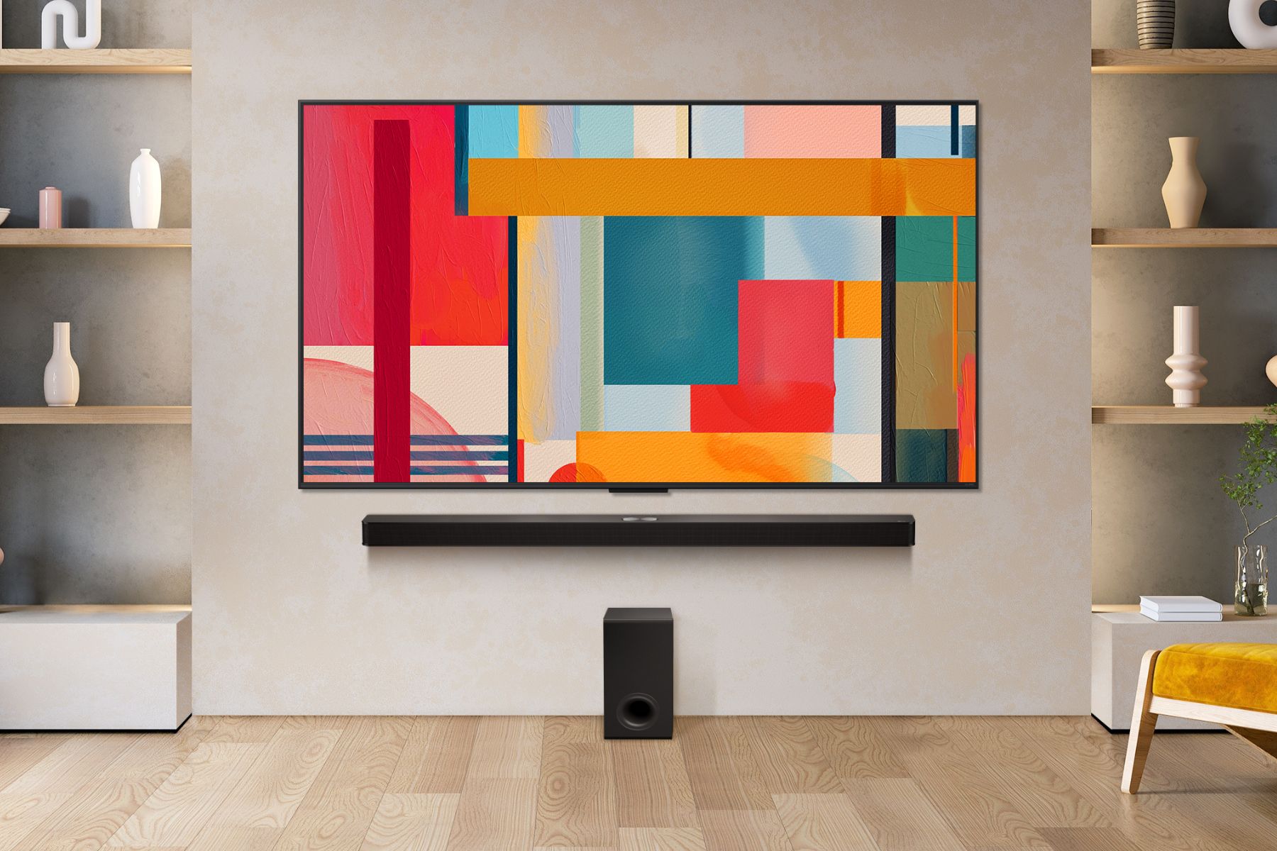 The screen can also take on a more ambient role. With music playback paired with visual displays from LG Gallery+, the TV shifts from entertainment hub to atmosphere-setter. Artwork, subtle motion graphics, or minimal visuals allow the screen to stay present without demanding attention, making it just as suitable for hosting guests or quiet evenings at home.