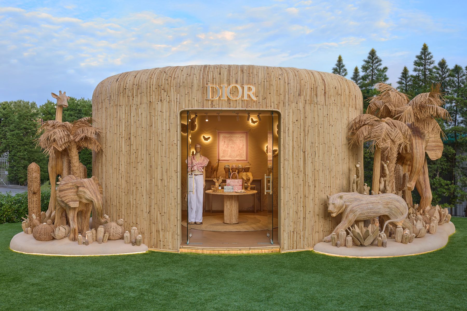 This tropical theme continues inside the pop-up boutique as well as the outdoor Dior Bamboo house, both housing the latest Dioriviera 2025 collection. Meanwhile, the lush terrace is punctuated with Dior parasols and deckchairs adorned with the emblematic Toile de Jouy motifs. There’s also a man-made “pool” filled with animal-shaped floats, adding a beach club vibe to the magical setting.