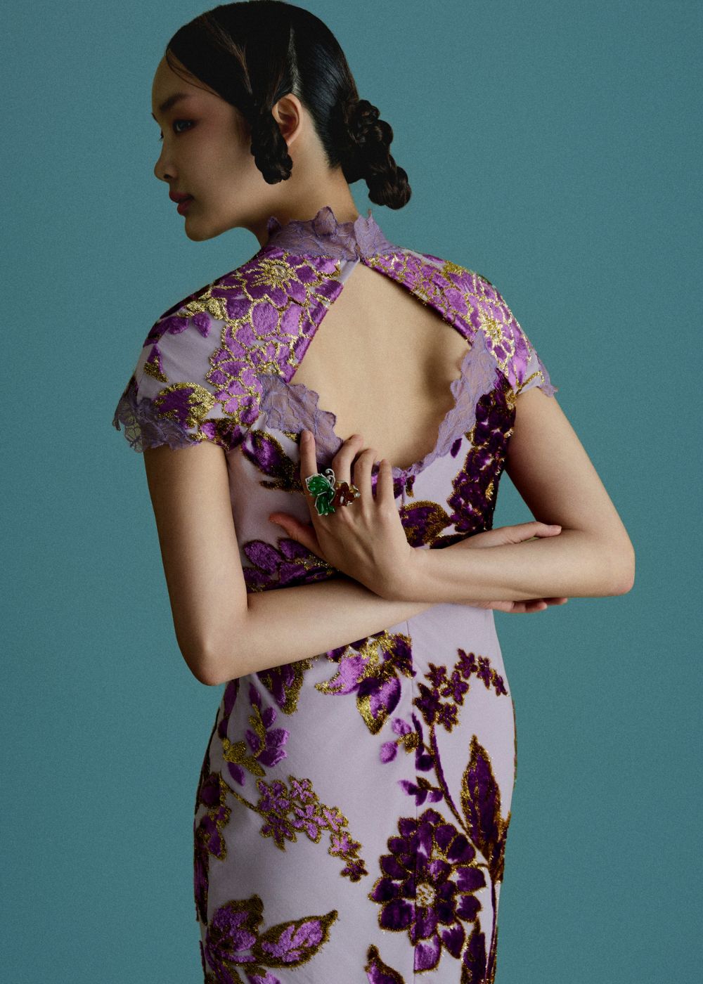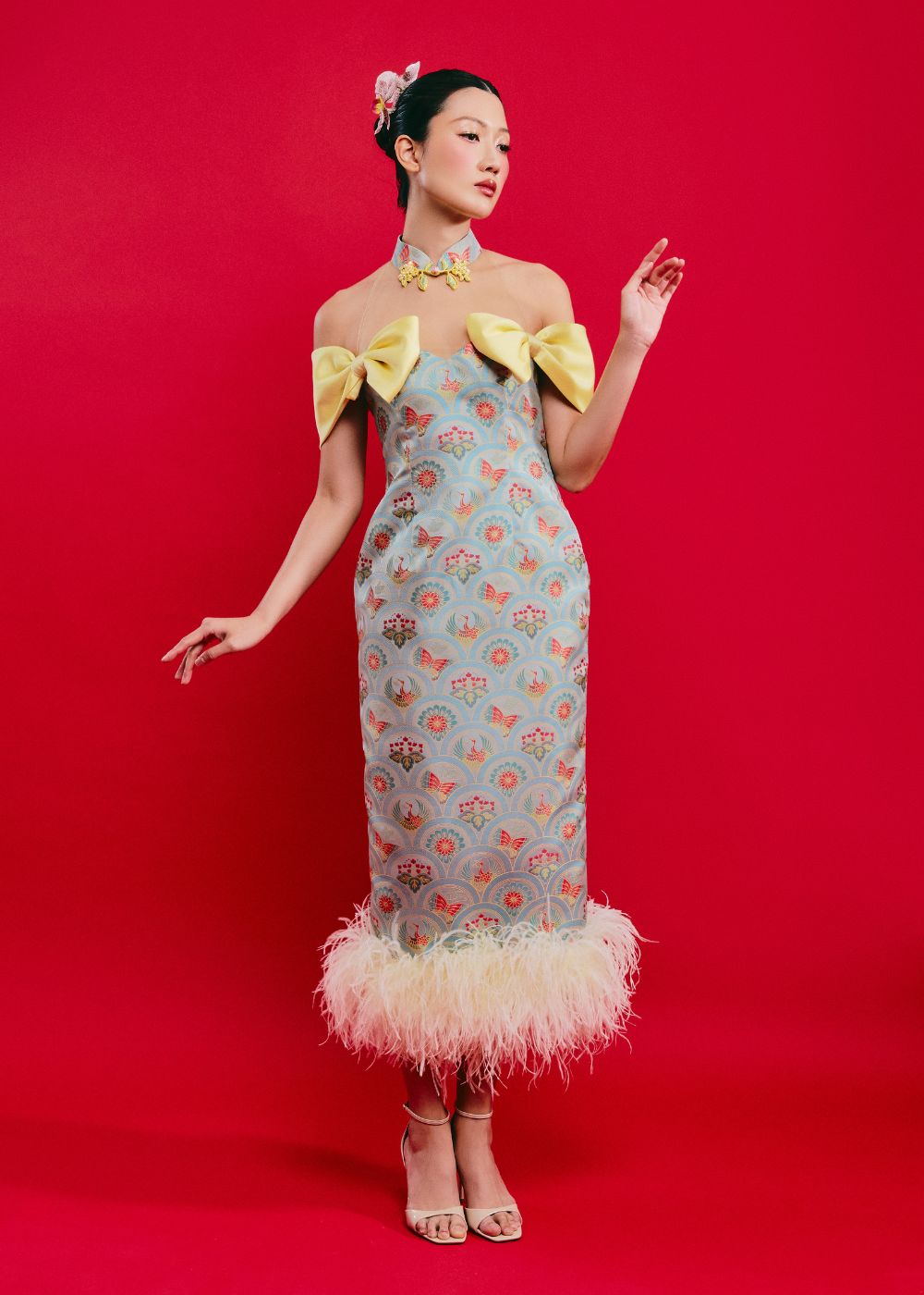 Khoon Hooi’s Bloom of Blessings collection dazzles with floral sequins cascading across qipao silhouettes. Each pastel-toned piece is a vessel of joy and prosperity, drifting between youthful playfulness and refined sophistication.