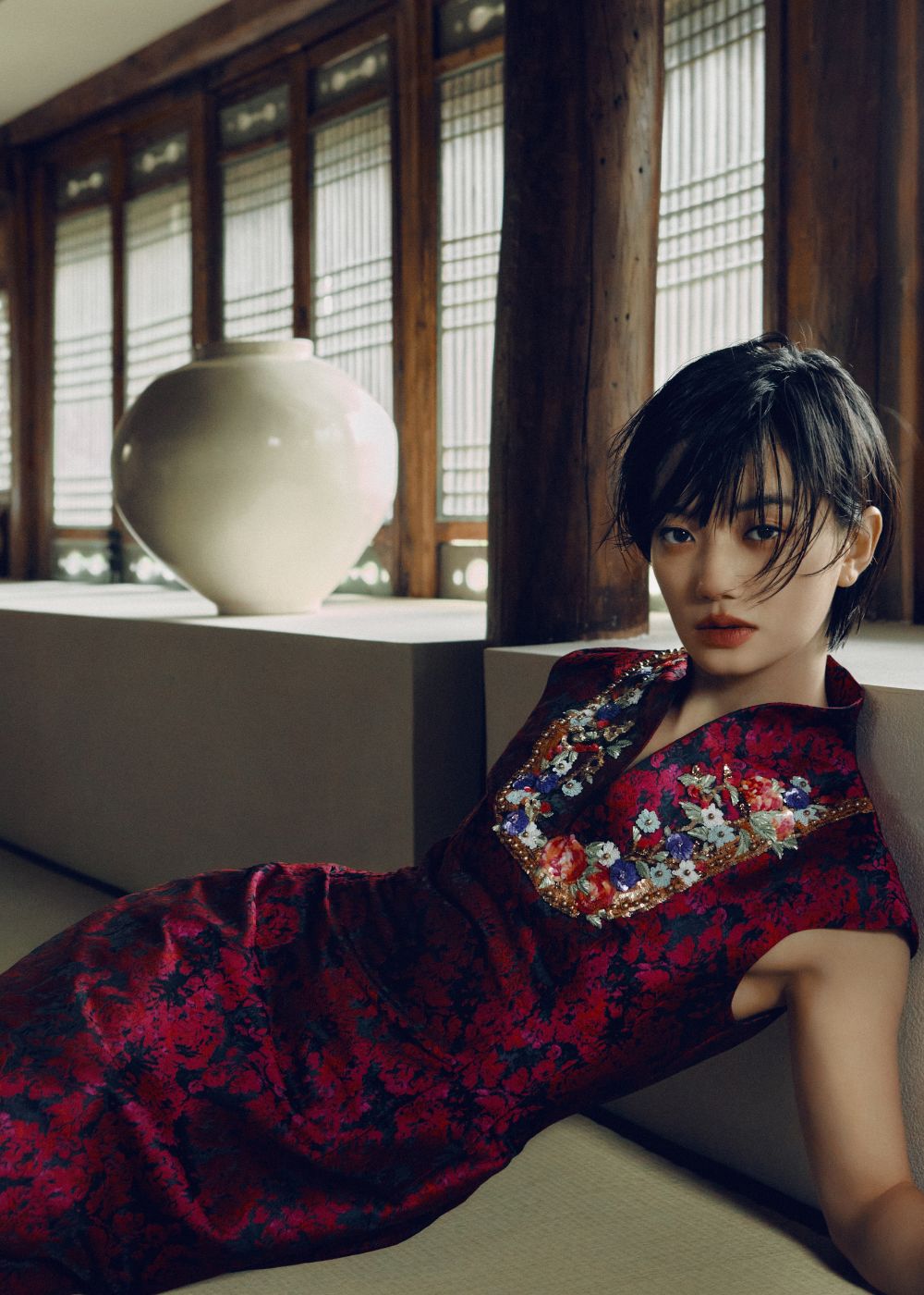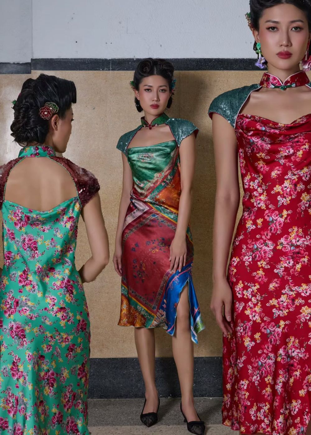 Cheongsams are reimagined in various ways. Some have a cowl neckline, while others are flared or raw-hemmed. Fabrics vary from light and flowy like satin to heavy and structured like brocade. The designer leans fully into her maximalist side for this collection, evident from the puffy sleeves, bold prints, and unique cuts.