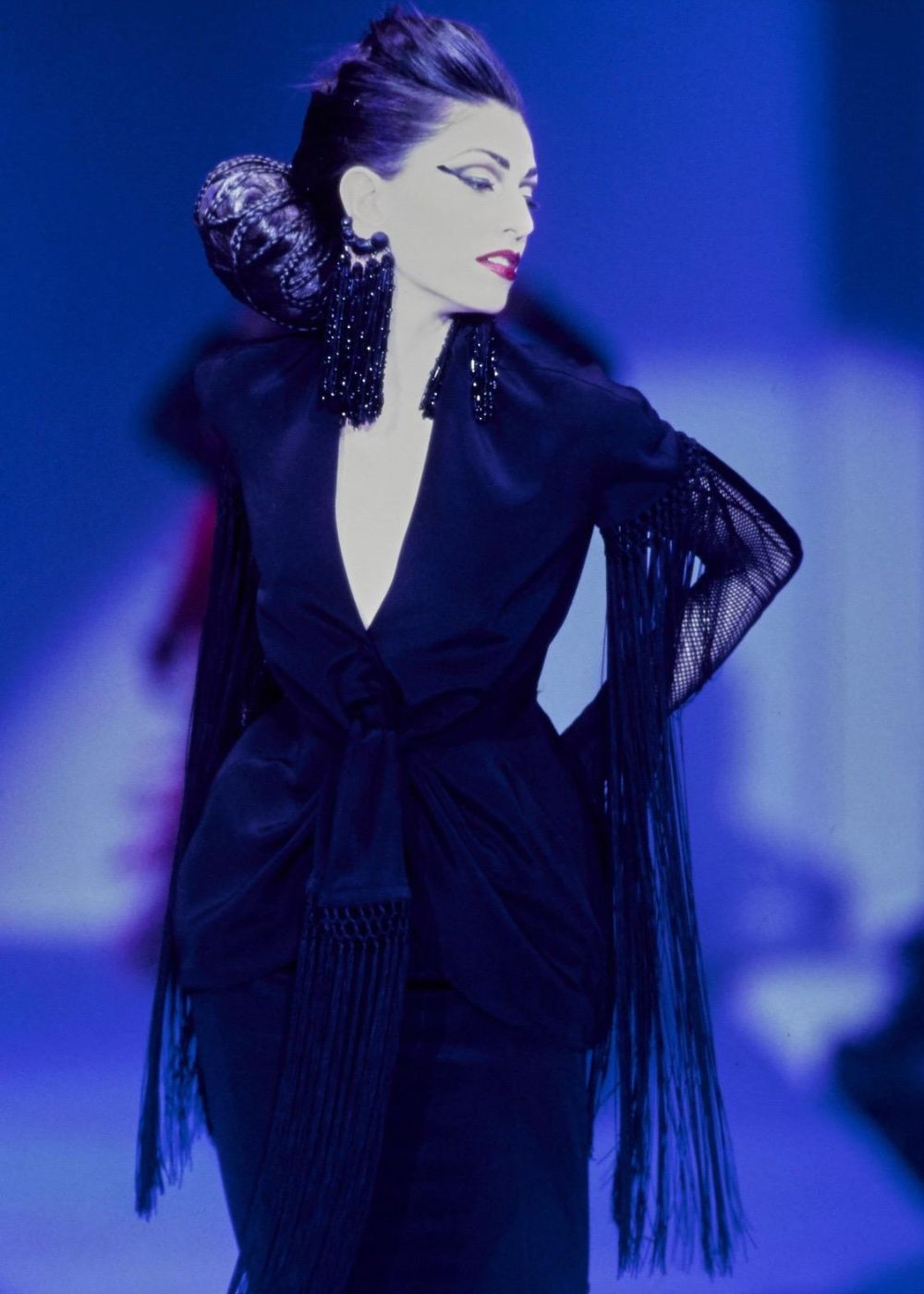 In fashion, the tassel trend has come and gone across centuries. Chanel famously introduced a tassel necklace known as the Chanel Sautoir in the 1920s. The piece was intentionally long, up to 30 inches, and designed to drape around the neck or cascade down one’s back. However, it wasn’t until Thierry Mugler’s Spring/Summer 1997 show that tassels appeared prominently on the runway. The radical designer reimagined tassels in a myriad of different ways, from statement earrings to shoulder trimmings.
