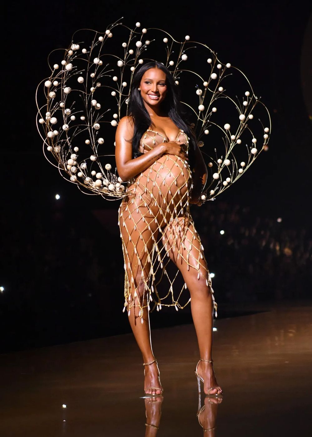 Jasmine Tookes made history this year by opening the show while nine months pregnant. She walked in a gleaming, gem-encrusted ensemble – complete with a sculptural cape replacing traditional wings – and paused midwalk to cradle her baby bump. Her moment set the tone for a show intent on redefining what a Victoria’s Secret runway could be: bold, vulnerable, and inclusive.