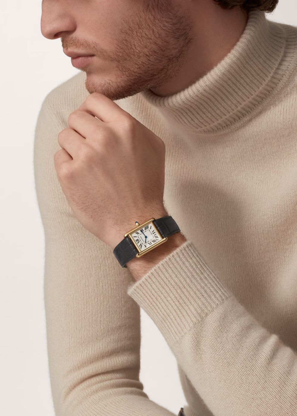 Cartier Tank Louis’ sleek and dainty design makes it the ultimate unisex choice. Although the brand is widely known for its jewellery, Cartier’s history in watchmaking is not to be reckoned with. The maison pioneered numerous inventions in the world of haute horlogerie, including opting for a rectangular case for the Cartier Tank, in contrast to the conventional round shape for wristwatches at the time. Both its name and curvilinear shape drew inspiration from the Renault FT–17 tank used during World War I. Using a quartz movement was no coincidence either, but rather a distinctive choice in ensuring high autonomy and precision. Additionally, the black alligator leather strap provides a durable, unique grain. It is no wonder Princess Diana made the timepiece a staple for her outfits, regardless of occasion.
