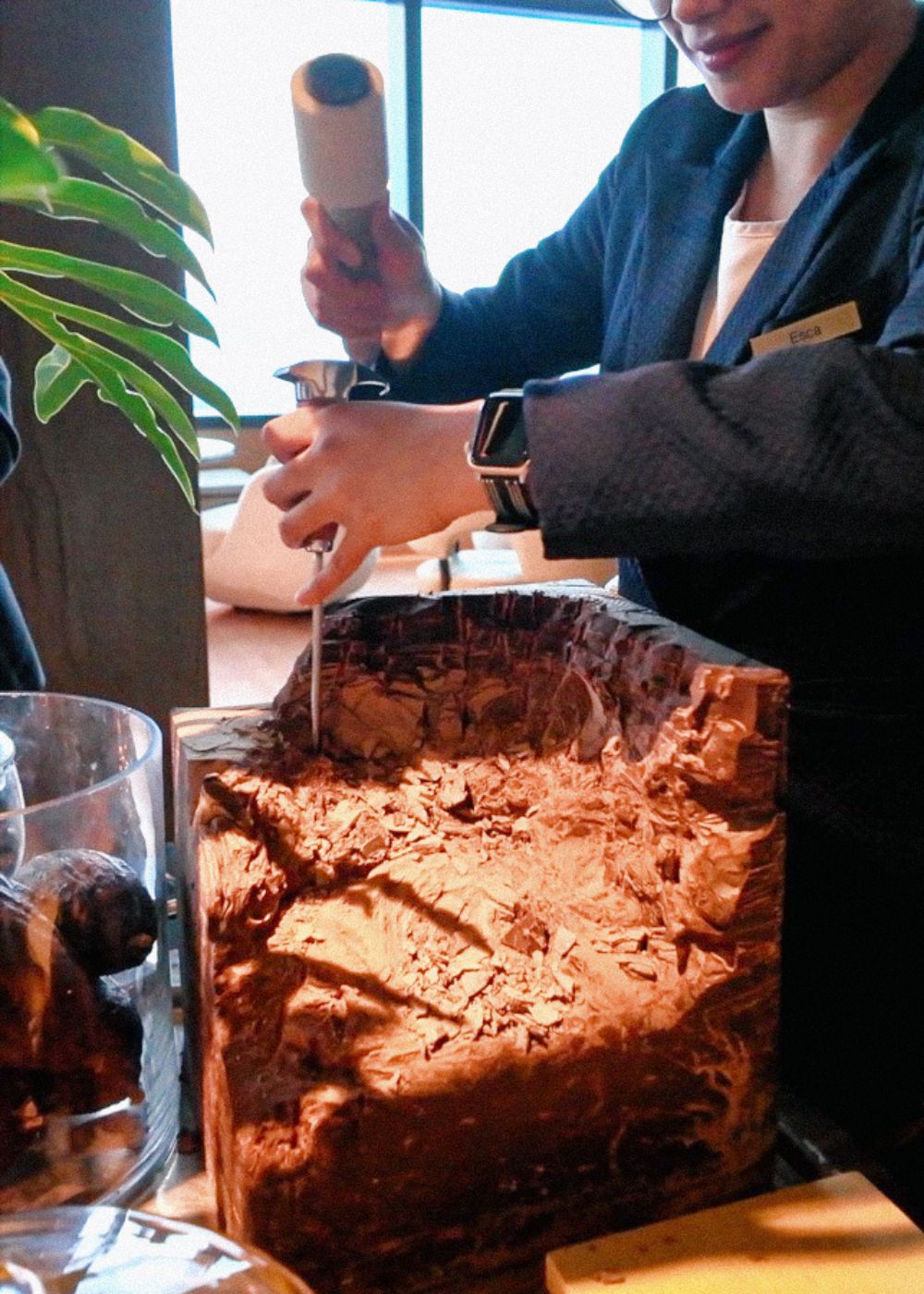 Highlighting the bar’s cacao theme is its signature 19kg house-made 70% Dark Chocolate block by Executive Pastry Chef Holger Deh, which is chiselled into shards at the chocolate table as a ceremony of sorts. A carefully crafted selection of pralines, brittles, and truffles surrounds this slab, reflecting the bar’s bean-to-glass philosophy.